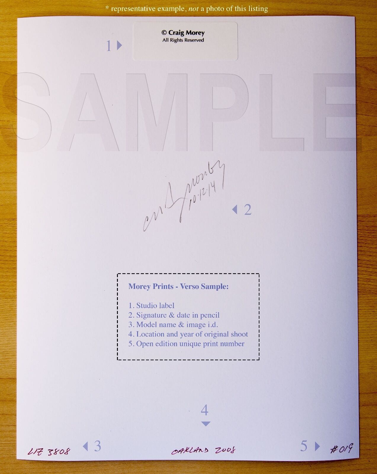 Specifications: This is a signed and numbered open edition 8.5×11 original exhibition print by Craig Morey. All prints are made with white borders, to maintain material quality and reduce handling damage. Artist’s signature appears in the lower right front, and the image details, studio label, and model name appear on back. Also written on the back is a unique edition number for each print.  (Note: artist logo and copyright info do not appear on the prints, only on the web versions)  All prints are custom made to order in the photographer’s studio.