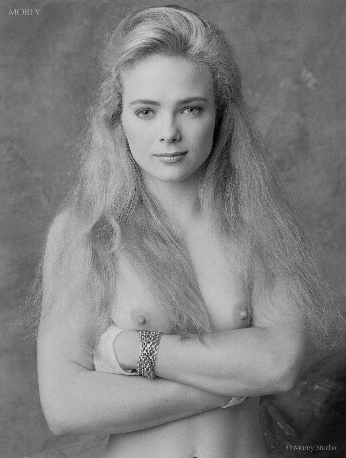 Description: Black & white nude portrait of model Octavia, front view with arms crossed, made in Emeryville studio 1991, This image is from a Hasselblad film shoot, using a classic 500CM medium format manual camera & 120mm PlusX film. The print is made from a hi-res scan of the original negative. Shot on assignment for Penthouse International, this image first appeared in European editions of the magazine.