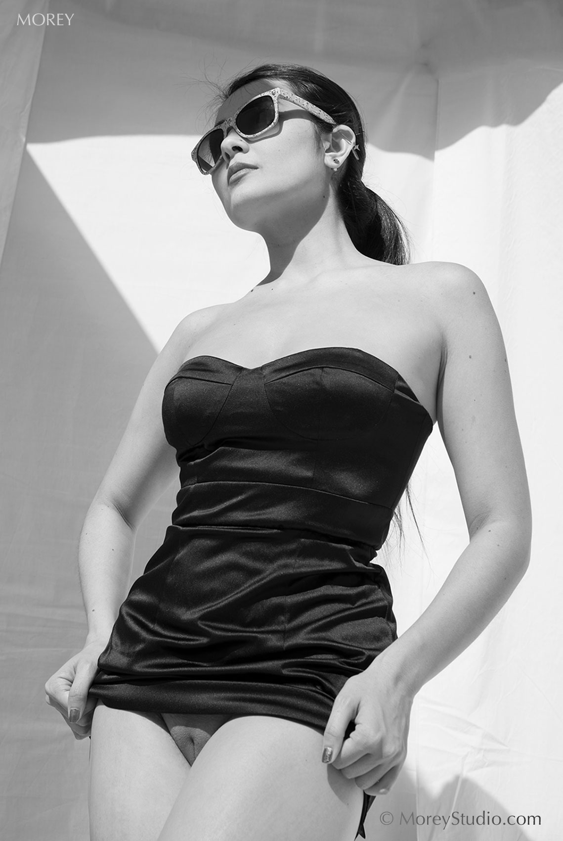 Description: Erotic nude b&w photo of US glamour model and adult film star Sophia Jade, in sunglasses and black dress, shot in our outdoor studio in San Leandro, 2014. This shoot was done using a Nikon D600 camera. Prints are made from the original high resolution raw file.
